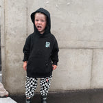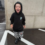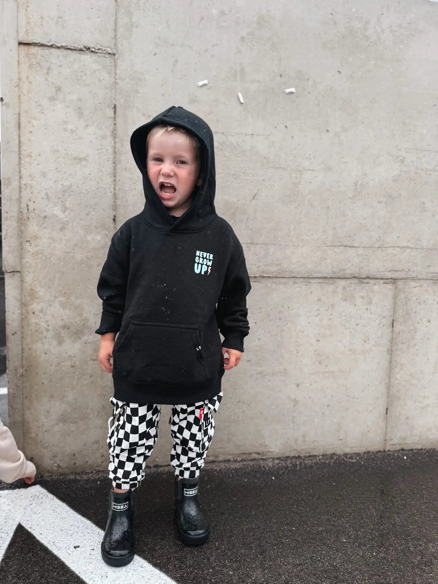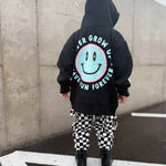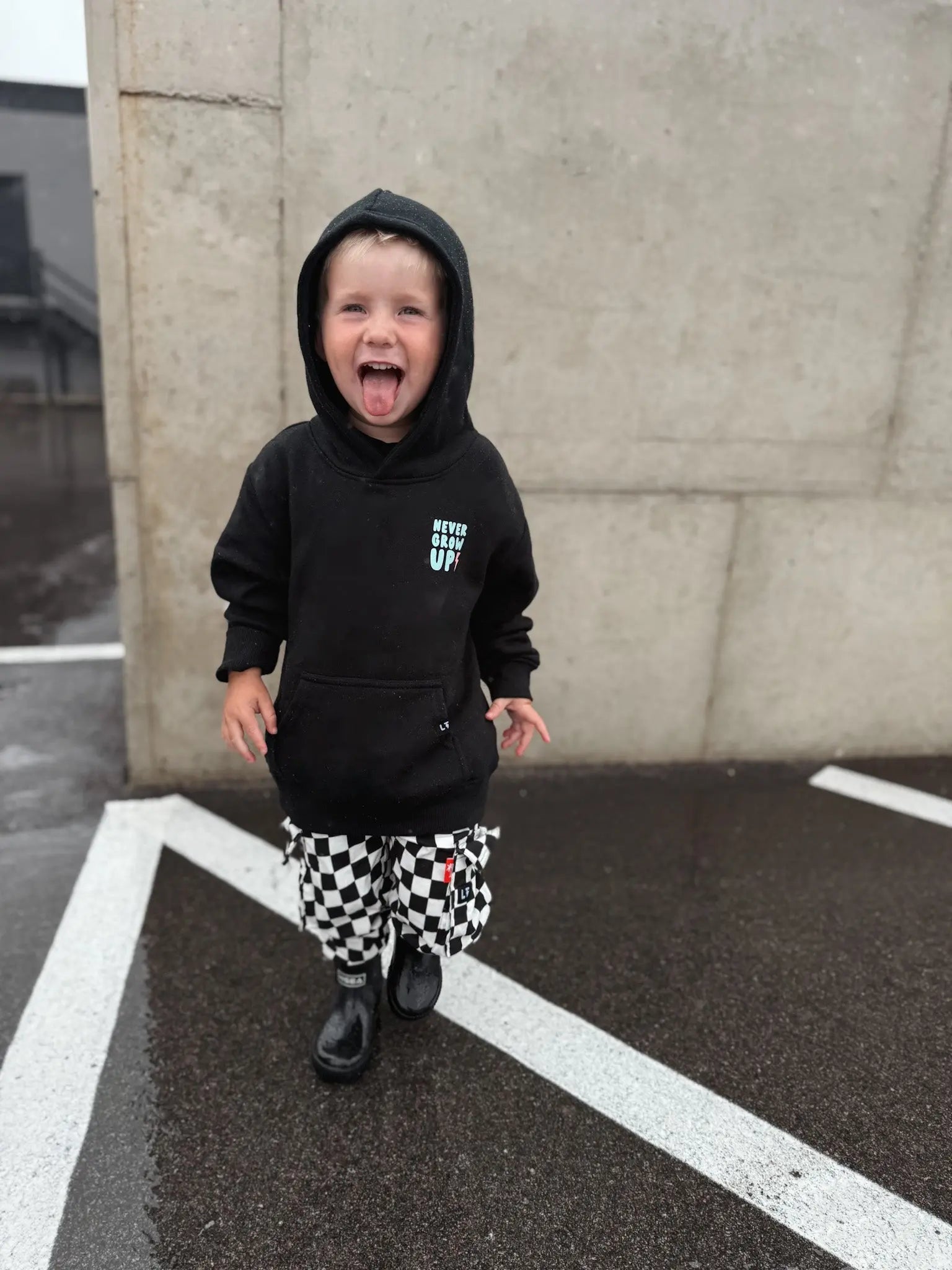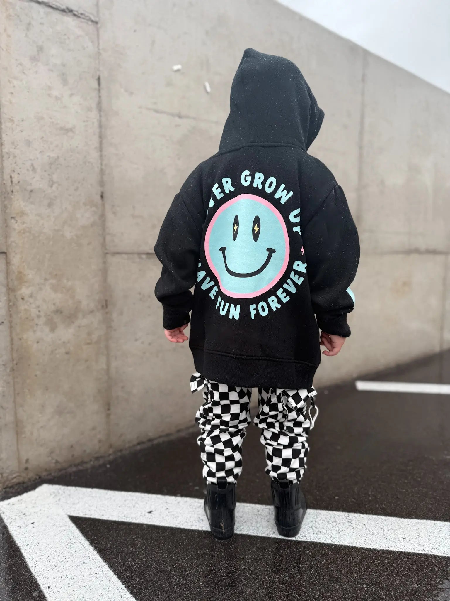 For the wild ones who refuse to outgrow the fun. The Never Grow Up Hoodie is made for littles who live loud, laugh hard, and play even harder. Featuring a bold smiley face graphic on the back with lightning bolt eyes and a reminder to “have fun forever,” this black hoodie brings major main-character energy to the playground. Crafted from cotton and bamboo with a roomy fit and cozy hood, it’s perfect for chilly mornings, puddle jumping, or any adventure that calls for a little extra attitude.