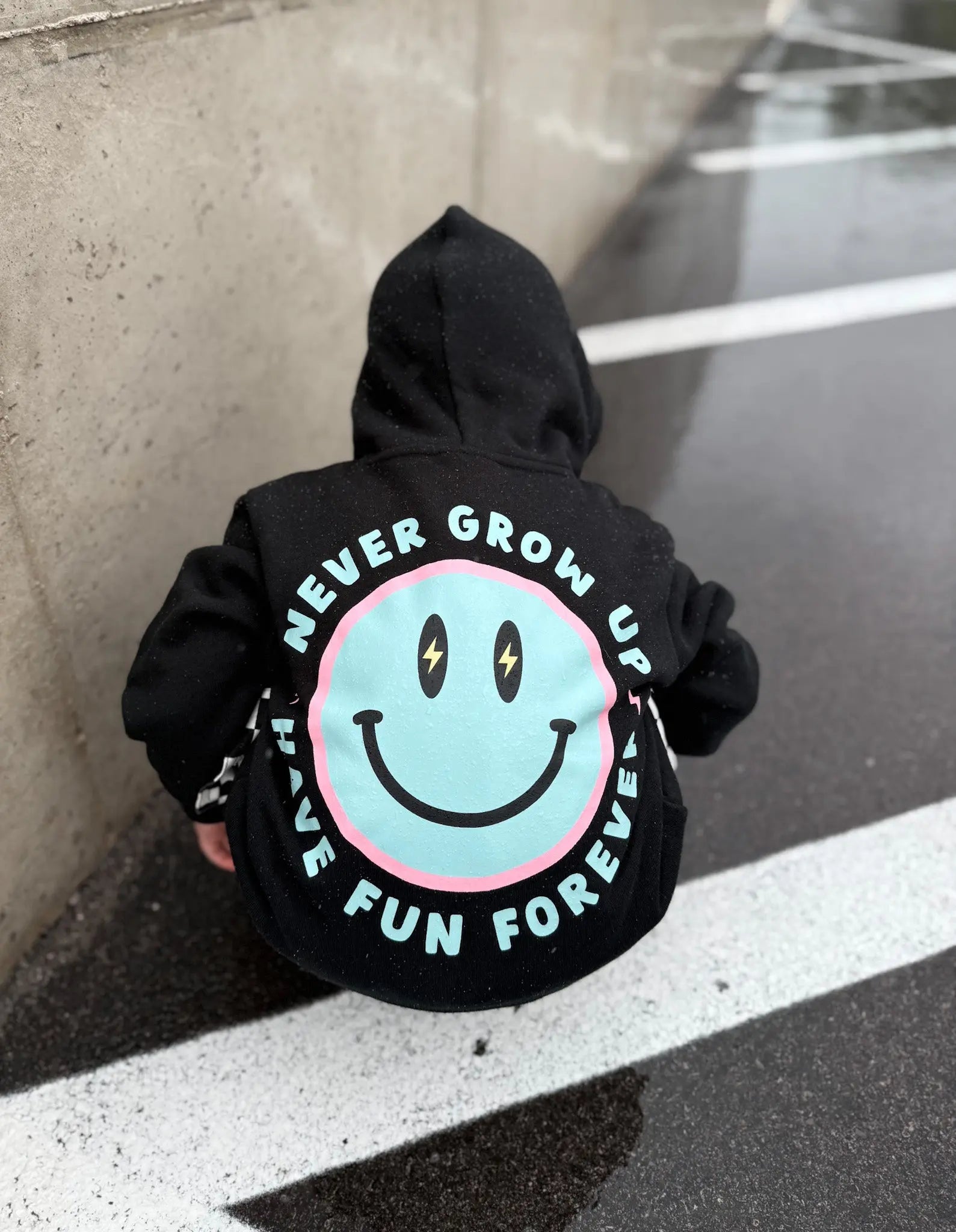 -Oversized smiley graphic with “Never Grow Up / Have Fun Forever” text