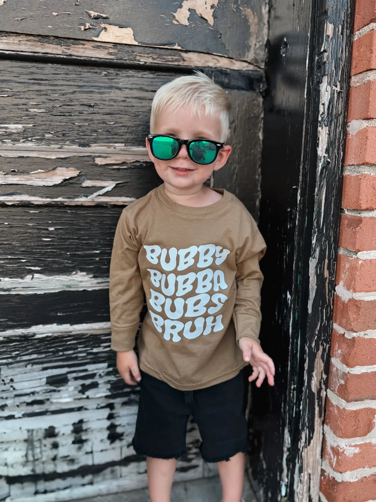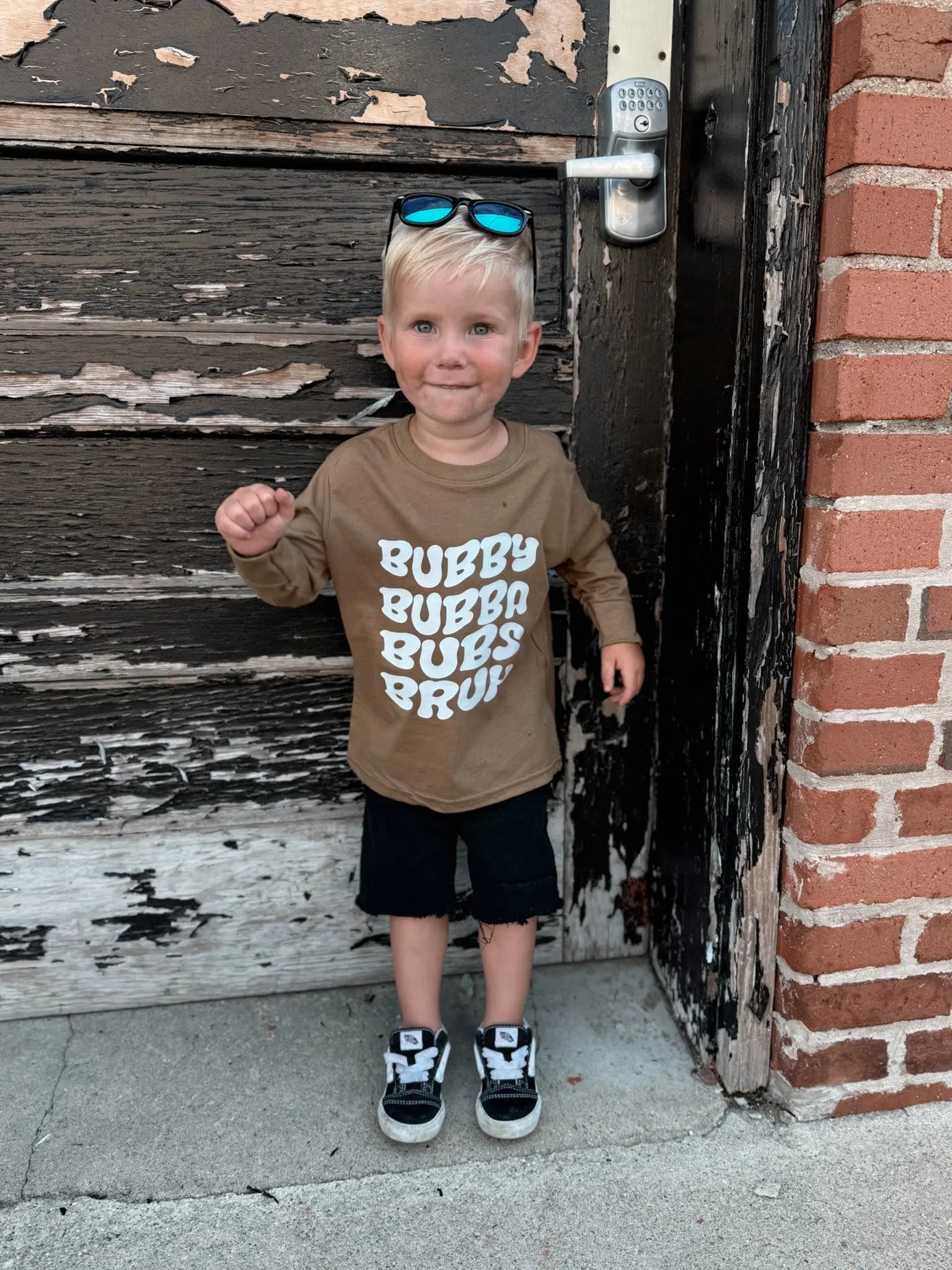 For the little dude with all the nicknames. Whether he's your Bubba, Bubby, Bubs, or straight-up Bruh, this long sleeve tee keeps things playful and comfy. Made from a soft, breathable cotton blend in a warm light brown shade, it’s perfect for layering or wearing solo as temps start to dip. The bold text across the chest adds a touch of personality that makes everyone smile. An easy favorite for park days, play dates, and every laid-back adventure in between.