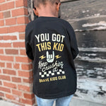 Meet the tee that brings big encouragement for your little one. Our "You Got This Kid" Long Sleeve Tee is all about confidence, courage, and cool style. Designed in classic black with bold retro-inspired graphics, this shirt features a motivational message on the back plus a checkered accent and rock on sign for extra attitude. Made from soft, breathable cotton and cut for all-day comfort, it’s perfect for school days, weekend adventures, or any moment they need a reminder of how awesome they are.