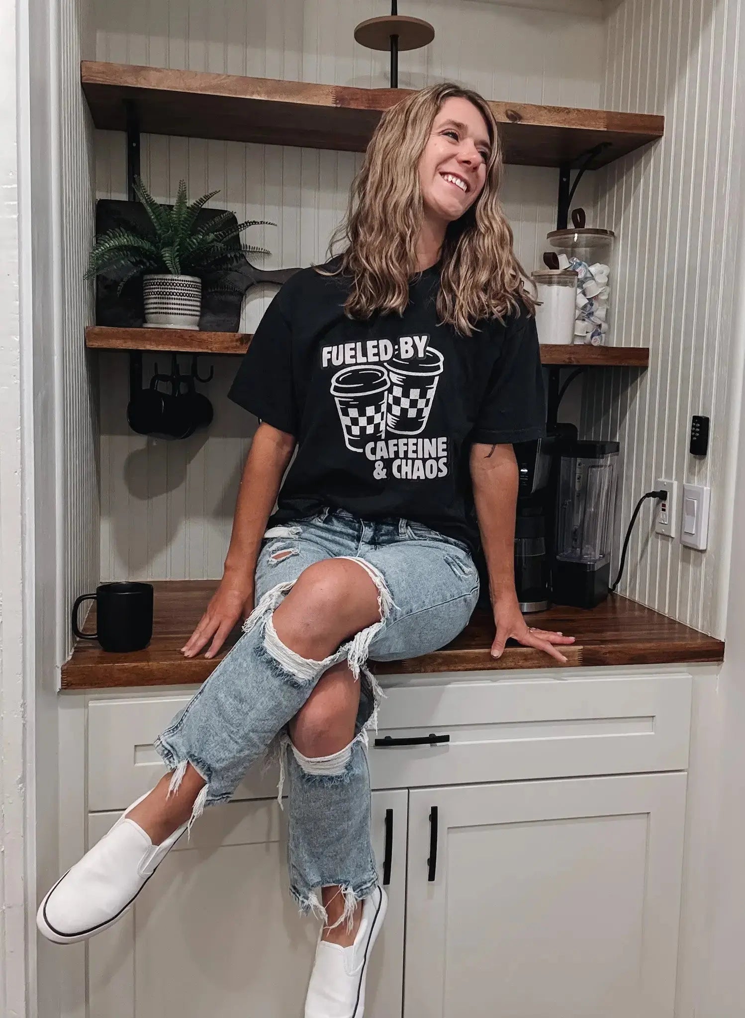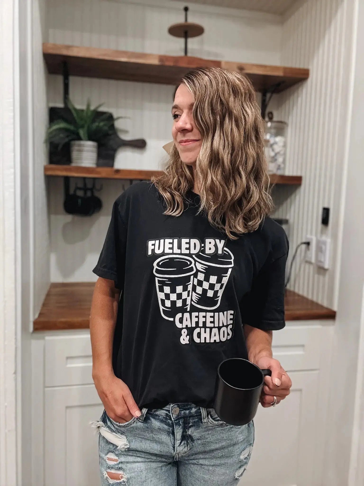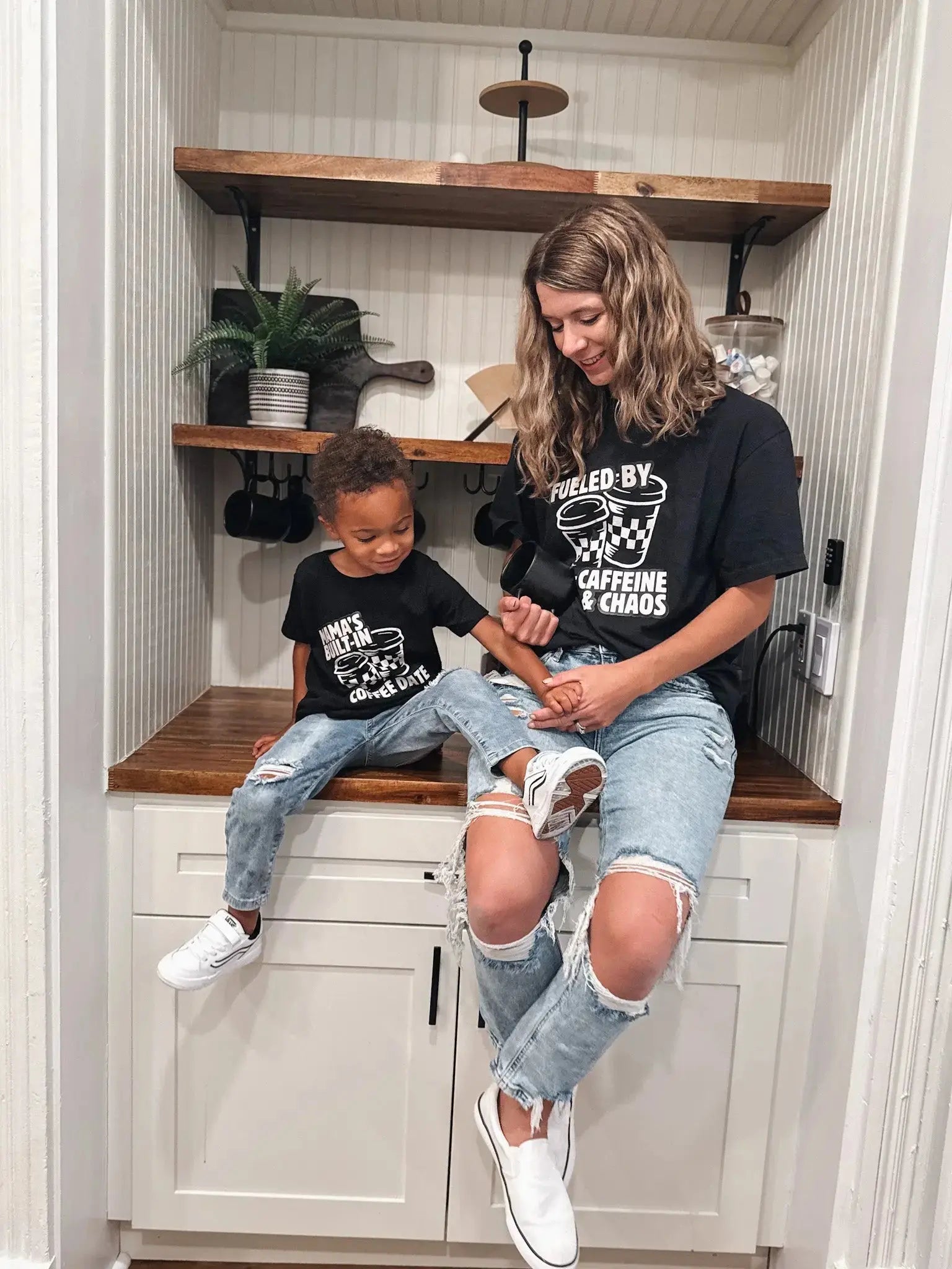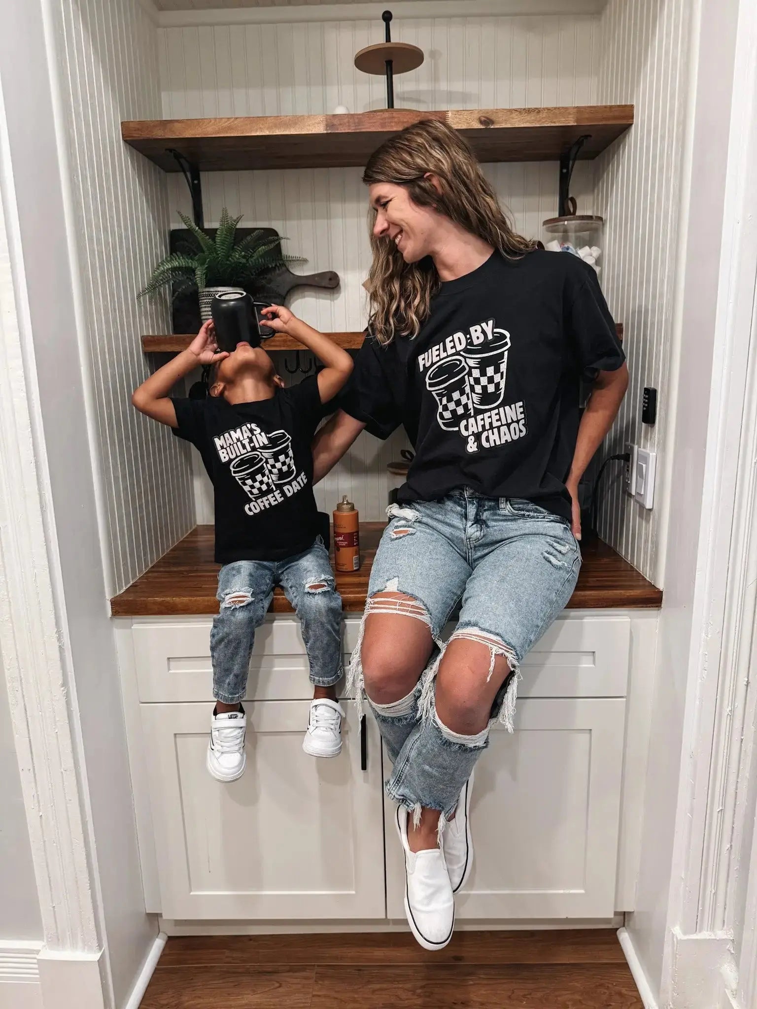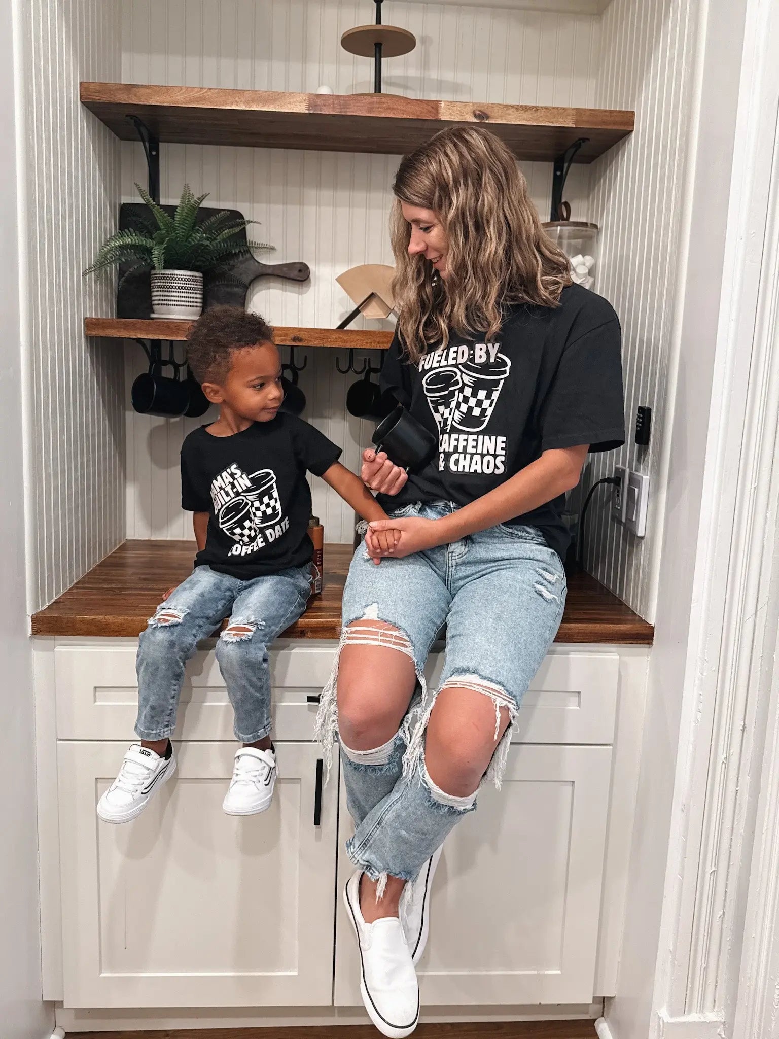 Fuel your day with style and a smile in this playful "Fueled by Caffeine" tee. Perfect for moms who run on coffee and cuddles, it’s an ideal match for mommy + me moments. Soft, comfy, and fun because every superhero mom deserves a little caffeine boost!