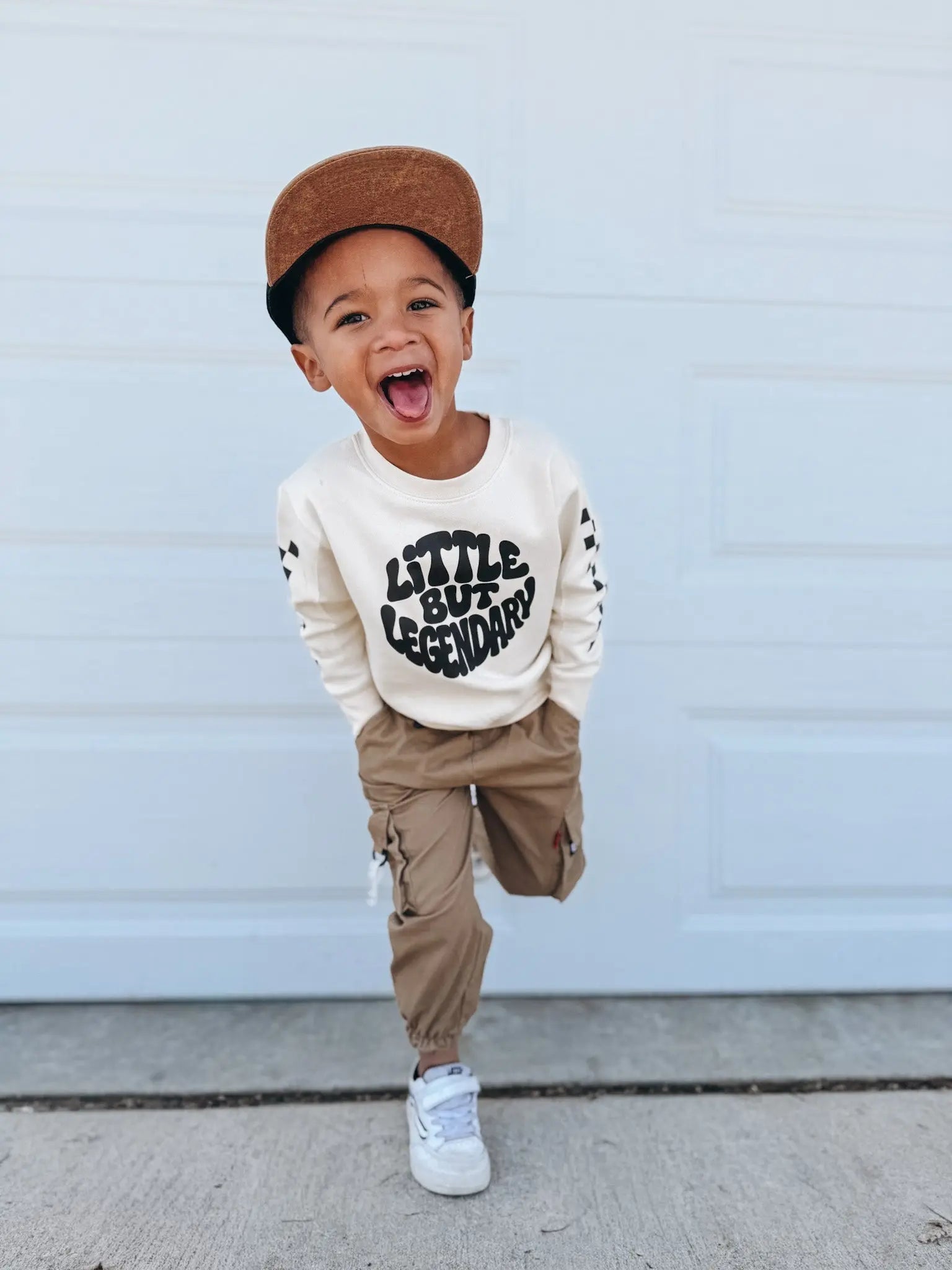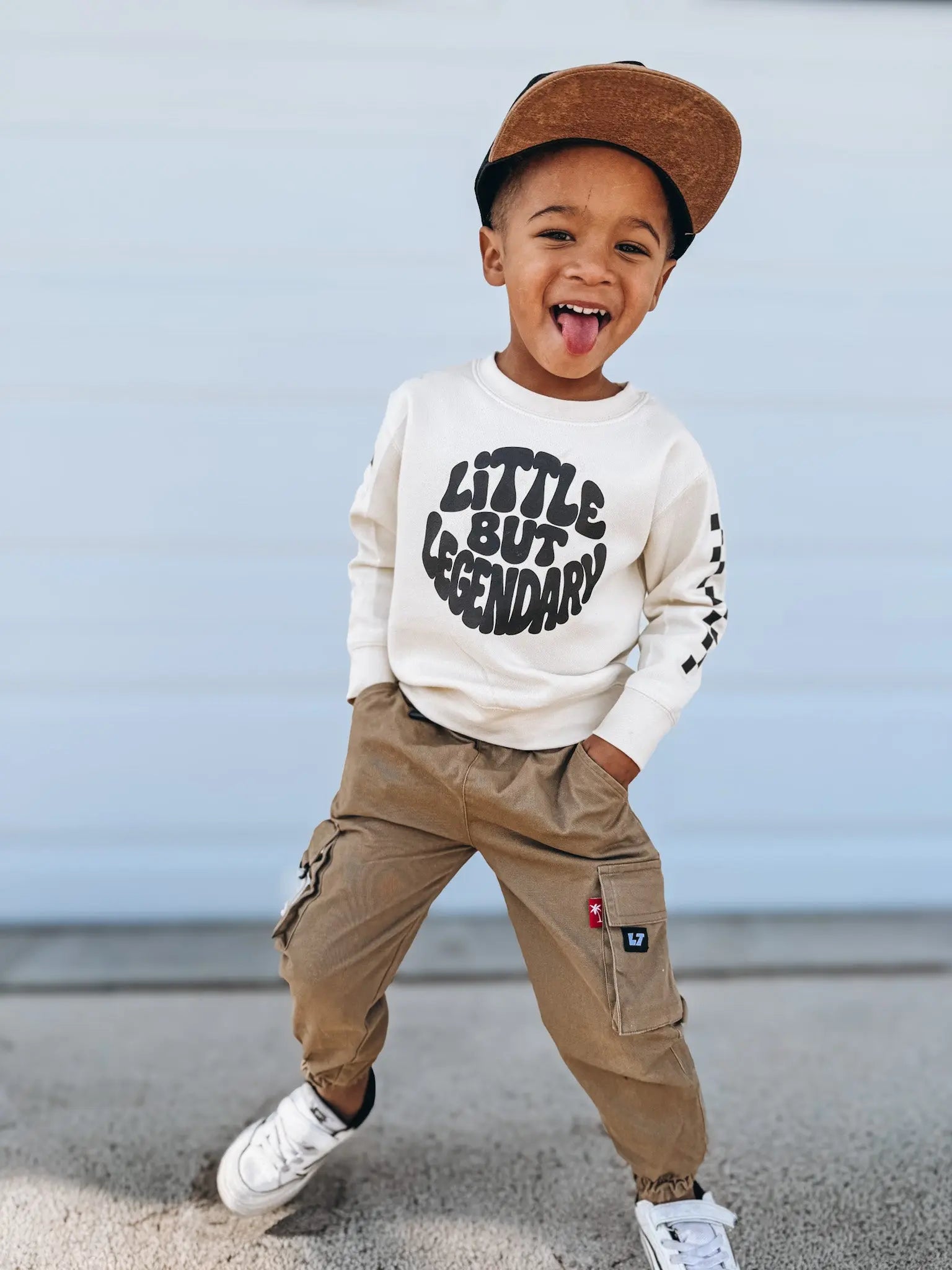 -Graphic Crewneck featuring "Little But Legendary" print with checkered sleeves