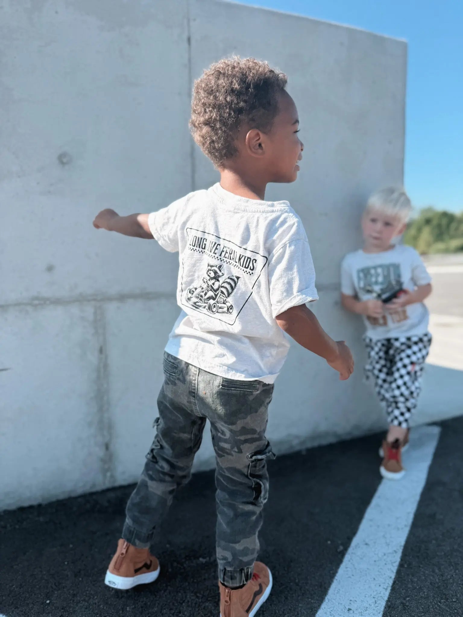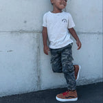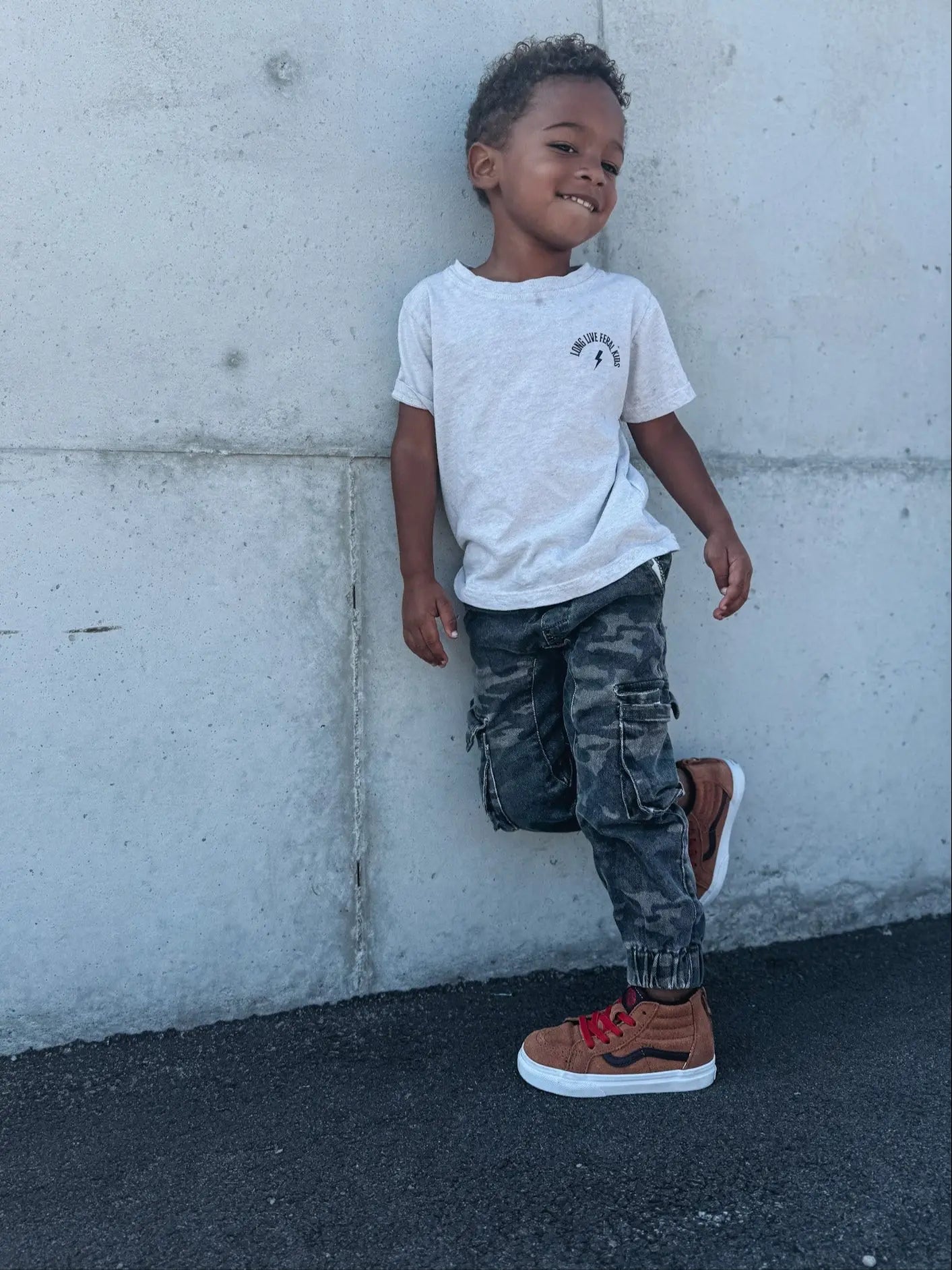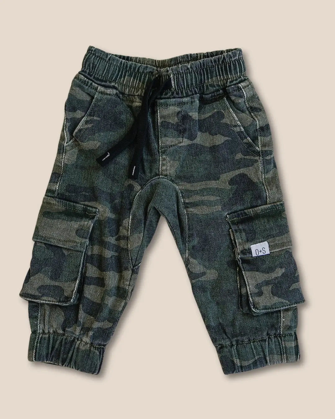 The Wes Camo Jeans bring fun and comfort together with a relaxed, baggy fit ideal for all-day adventures. Equipped with cargo pockets on each leg, they provide perfect spots for little explorers to stash their favorite finds. The elastic waistband and drawstring ensure a comfy, adjustable fit, while elastic ankle cuffs keep everything snug during active play.