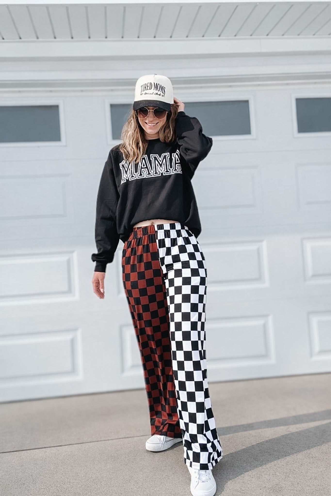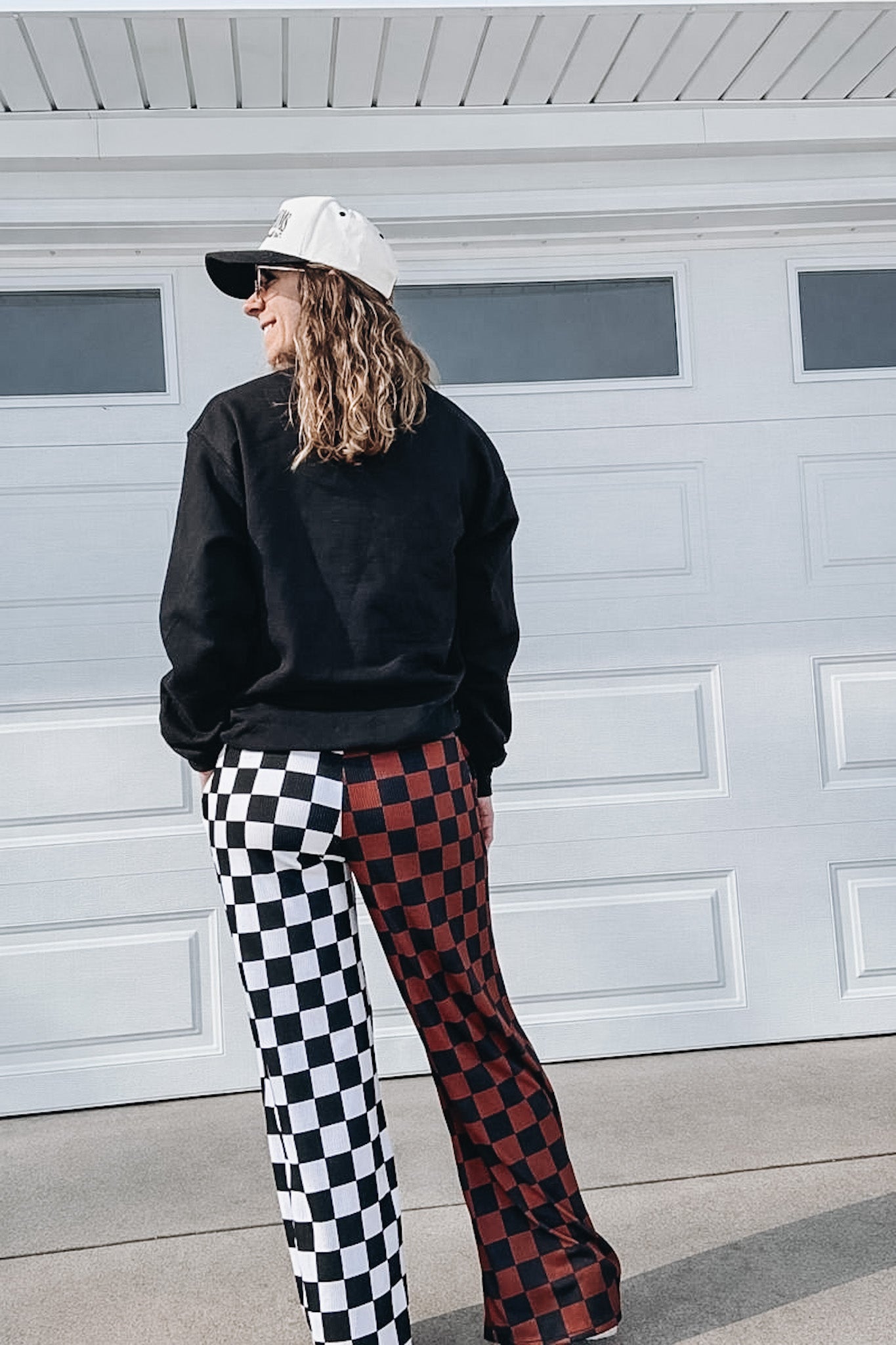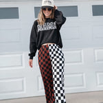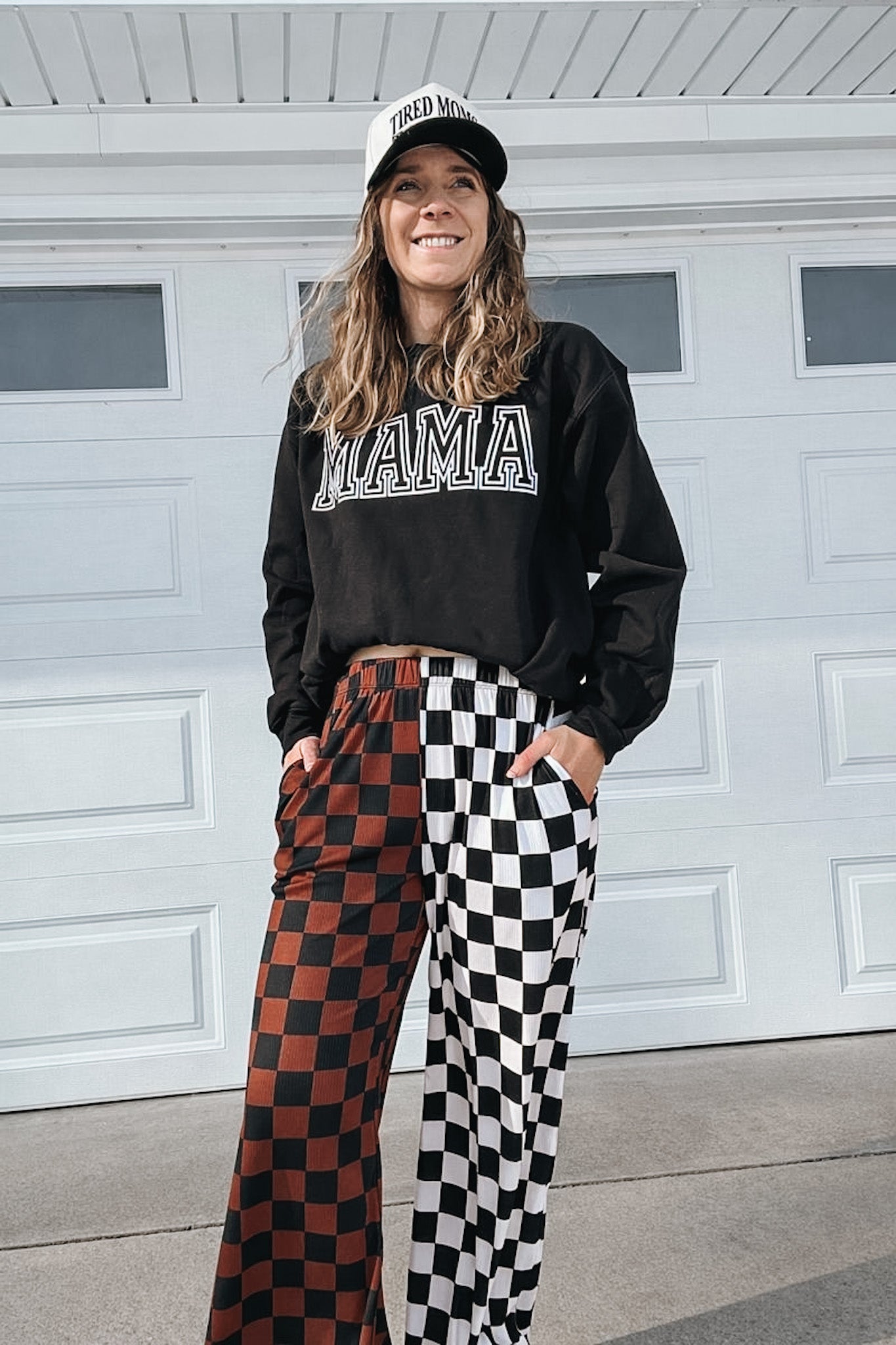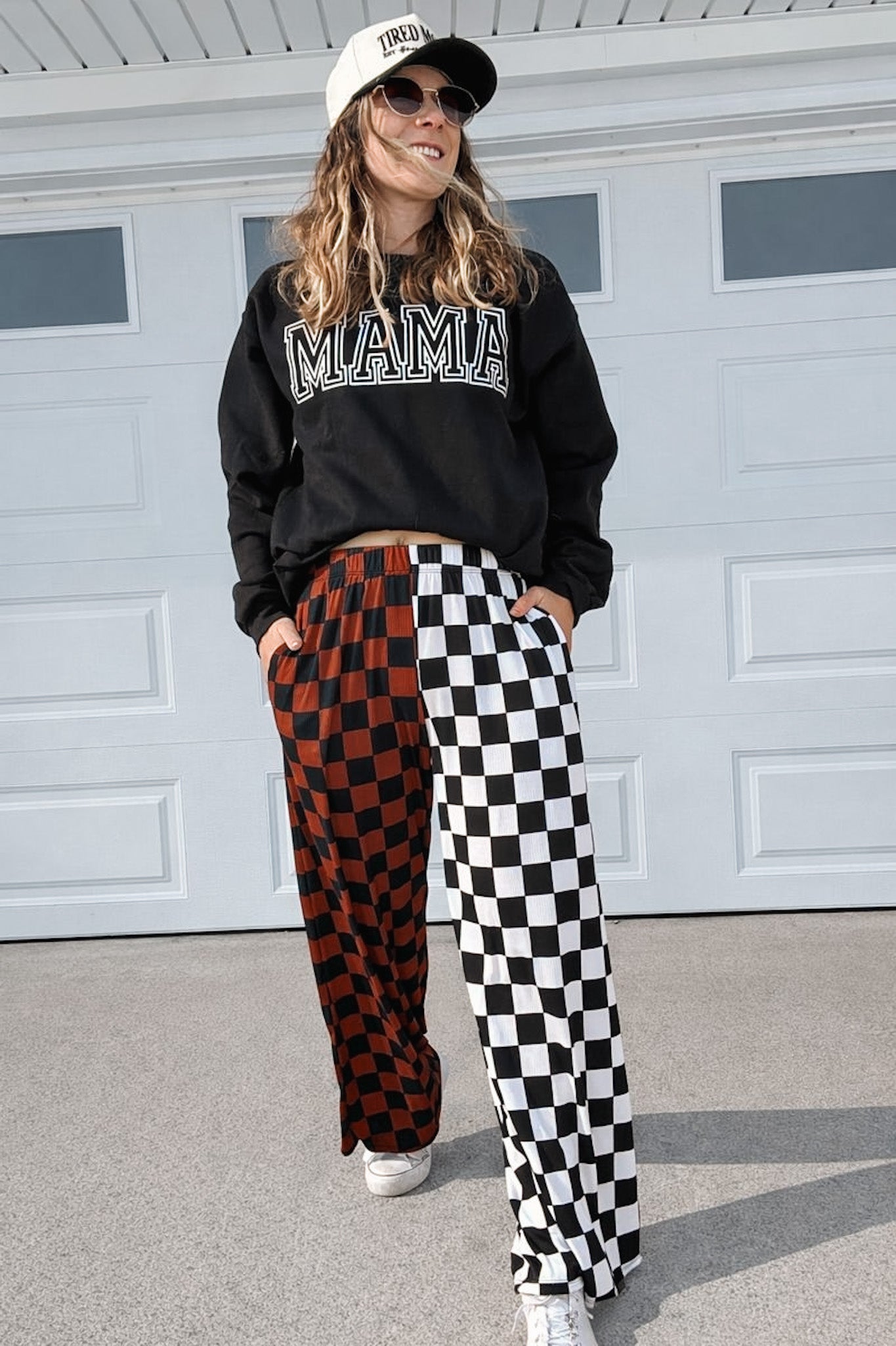 Make a bold statement with these Wildcard Checkered Pants! Featuring an eye-catching two-tone checkered pattern, these pants bring instant personality to any outfit. The super stretchy, soft fabric moves with you all day long, while the elastic waistband keeps everything comfortably in place. With a full-length, wide-leg silhouette, they're perfect for anyone who loves to stand out and have fun with fashion. Did we mention they have pockets? A girl's best friend.